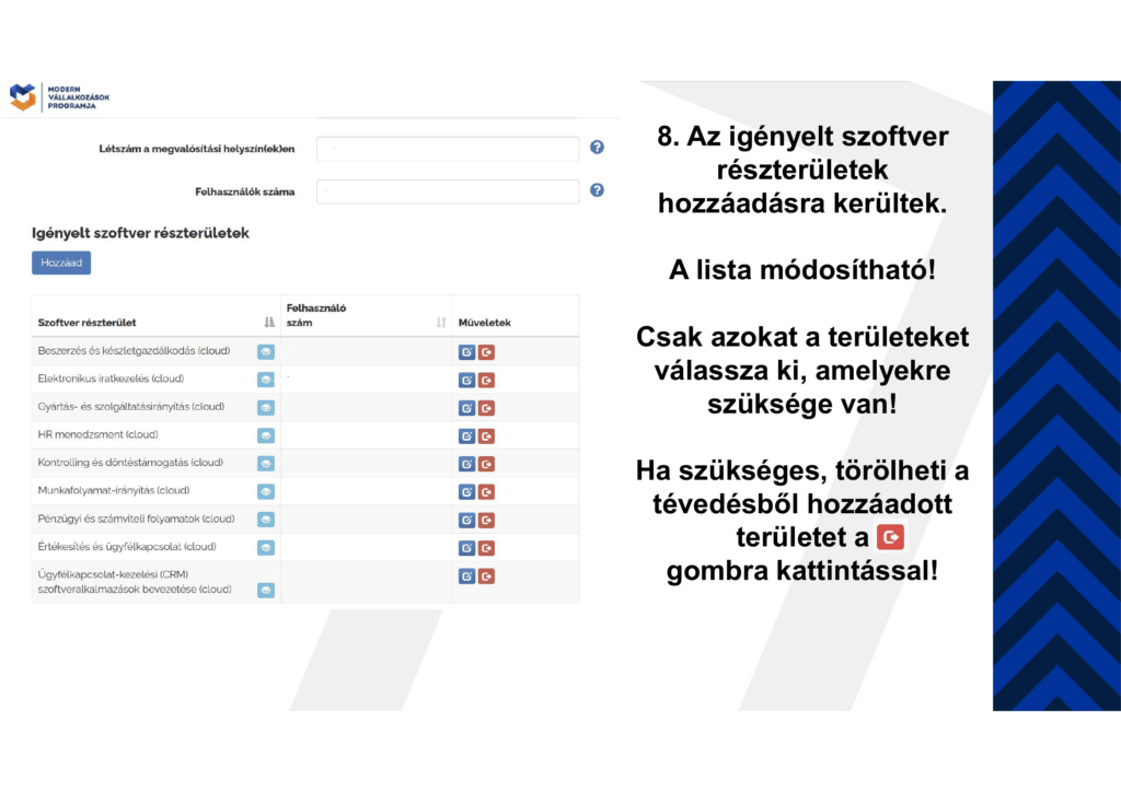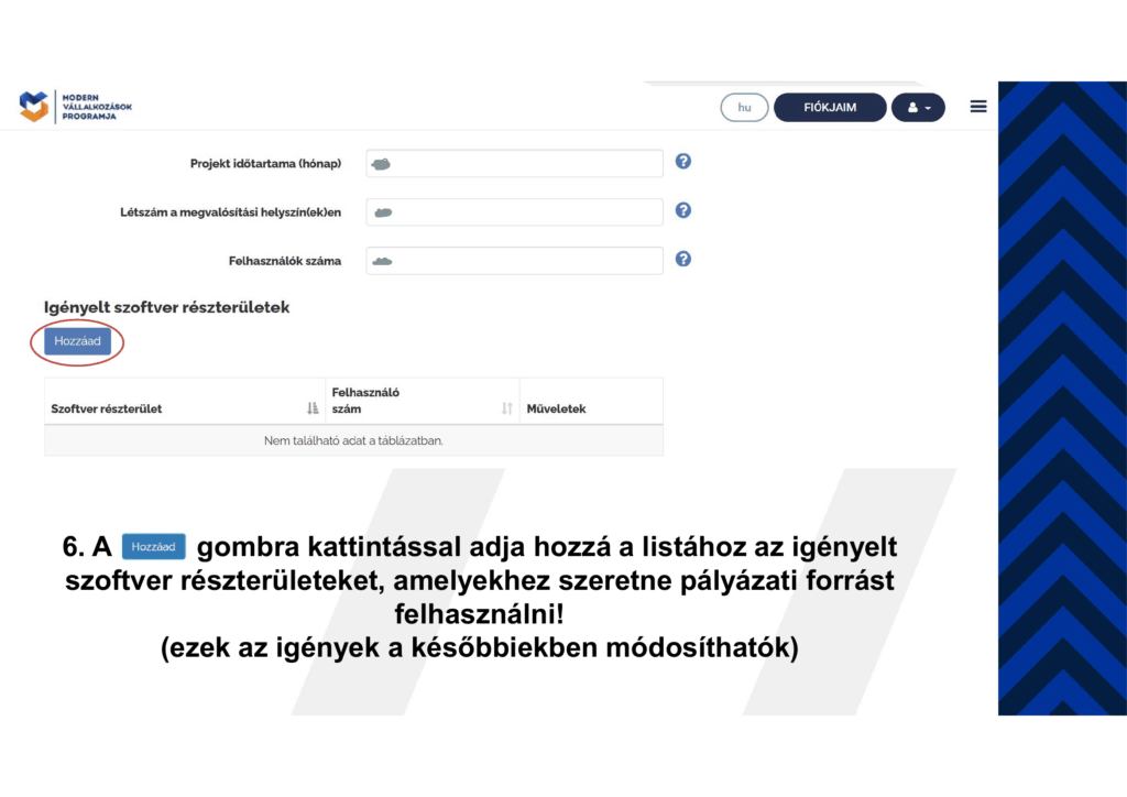 A következő lépés a projekt részleteinek rögzítése. Ide tartozik az időtartam, a munkavállalói létszám és a felhasználószám pontos megadása. Sok ügyfél itt szokott bizonytalankodni, hogy milyen adatokat írjon be. Mi minden esetben javasoljuk, hogy a tényleges működést tükrözzék ezek az adatok, mert a későbbi ellenőrzések során könnyen kiderülhetnek az eltérések. Az igényelt szoftver-részterületek hozzáadásánál a rendszer lehetőséget ad többféle választásra, és itt érdemes átgondolni, hogy melyik felel meg a vállalkozás valódi igényeinek. A kiválasztás után lehetőség van módosításra is, így a folyamat rugalmas marad. Mi, mint szakmai partnerek, ebben a lépésben is segítséget nyújtunk, hogy az ügyfelek a legjobb döntést hozzák meg.