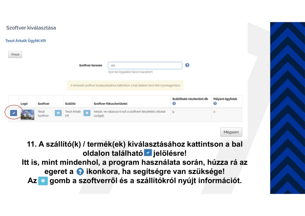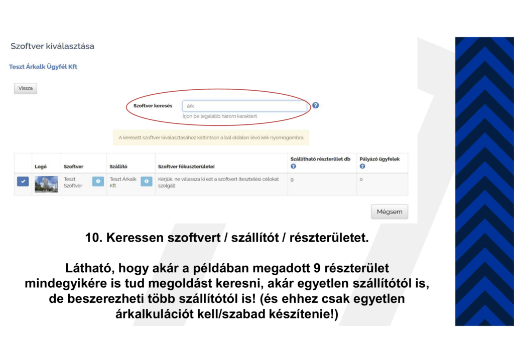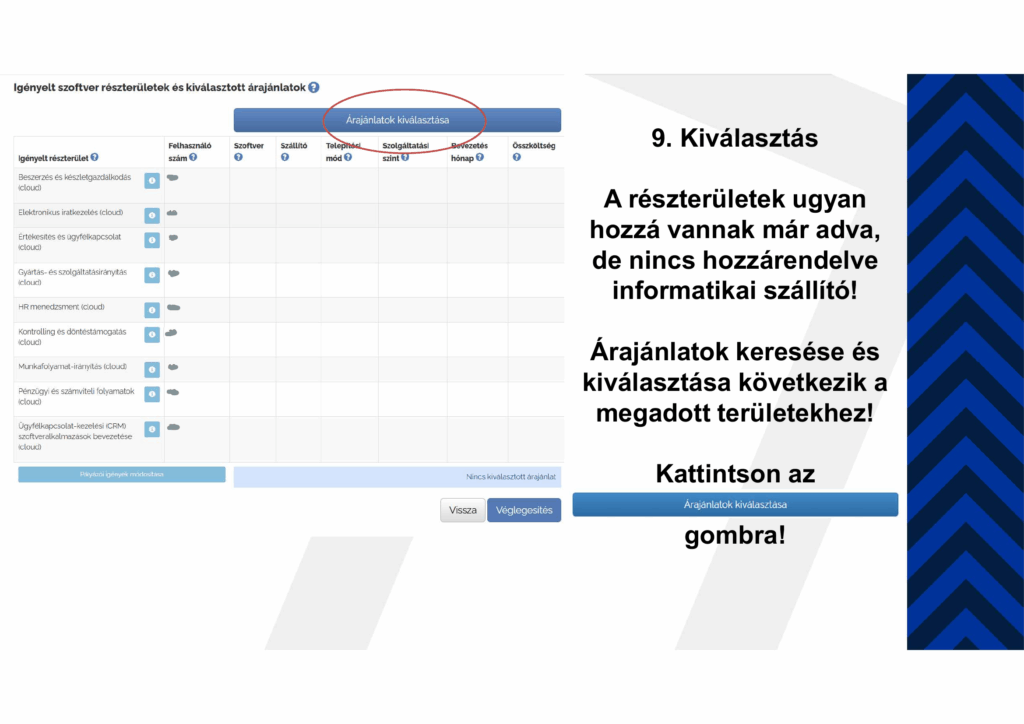 A folyamat utolsó szakasza a szállítók és termékek kiválasztása. A rendszerben több akkreditált partner közül lehet választani, és itt jelenik meg a mi cégünk is, amely részletesen bemutatja online marketing szolgáltatásait. Az ügyfelek egyszerűen megtalálhatnak minket a hivatalos felületen: