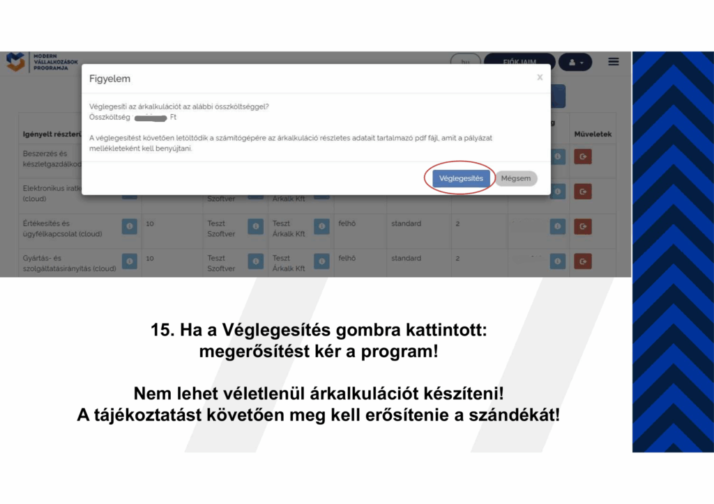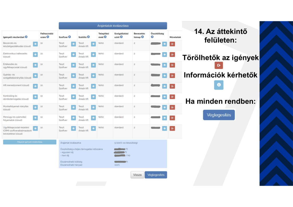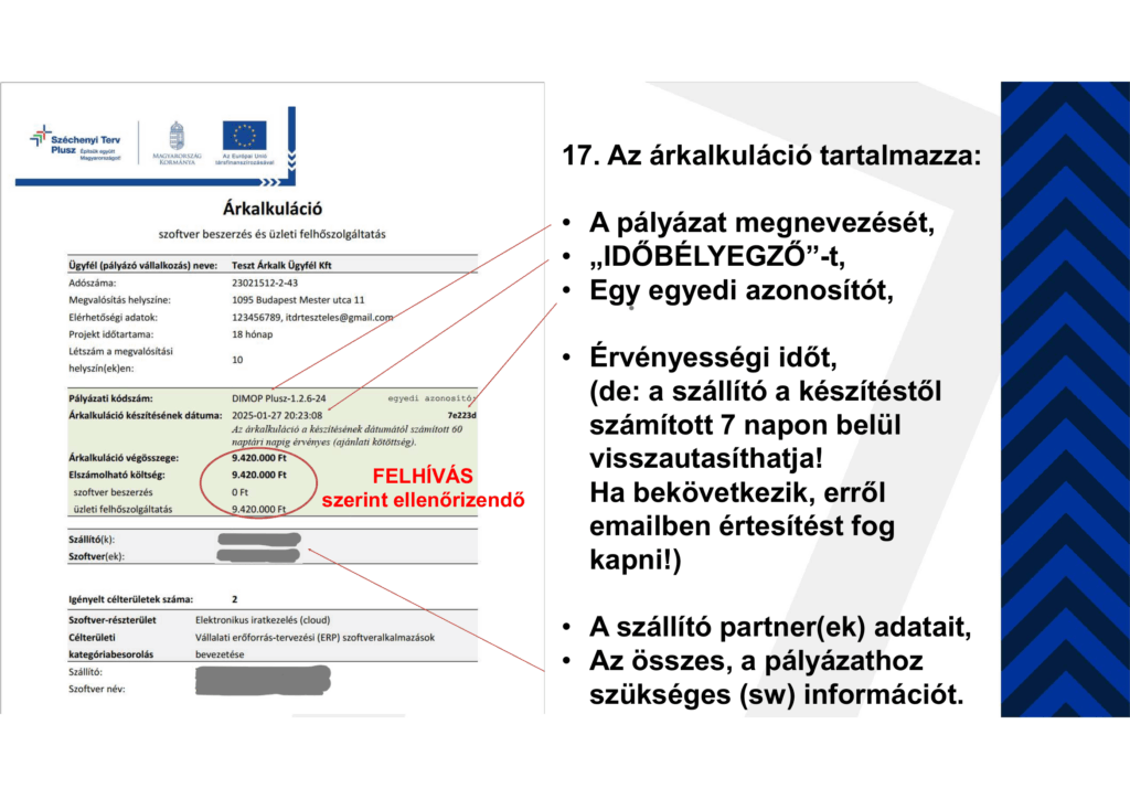 A kiválasztott termékek és szolgáltatások alapján a rendszer elkészíti az összesített árkalkulációt. Fontos, hogy a véglegesítés előtt minden adatot újra ellenőrizzenek, hiszen a hibásan megadott információk a pályázat elutasítását eredményezhetik. Az árkalkuláció letölthető PDF formátumban is, amely tartalmazza a pályázat nevét, az időbélyegzőt, az egyedi azonosítót, az érvényességet, valamint a szállító és a termékek adatait. Mi segítünk abban, hogy minden szükséges elem helyesen szerepeljen a dokumentumban, így az ügyfelek biztosak lehetnek abban, hogy a beadott anyag megfelel a pályázati követelményeknek.