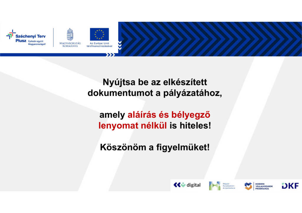 Fontos kiemelni, hogy cégünk akkreditált kivitelező és szállító a Modern Vállalkozások Programjában, ami garanciát ad arra, hogy ügyfeleink megbízható, hivatalosan elismert partnerrel dolgoznak együtt. Ez a státusz nemcsak szakmai hitelességet biztosít, hanem növeli a bizalmat is, hiszen minden pályázati projekt során az átláthatóság és a minőség áll a középpontban.
